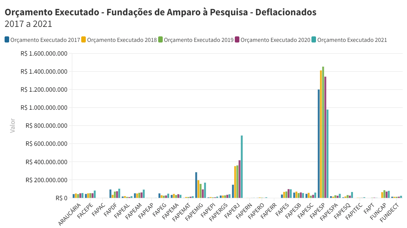 Geralmente são projetos menores mas de importância estratégica para o estado, porém, algumas FAPs com orçamento maior, como a FAPESP ou FAPRJ, conseguem financiar projetos na casa dos milhões. Para comparação, veja abaixo a discrepância entre o orçamento executado por cada fundações entre 2017 e 2021.